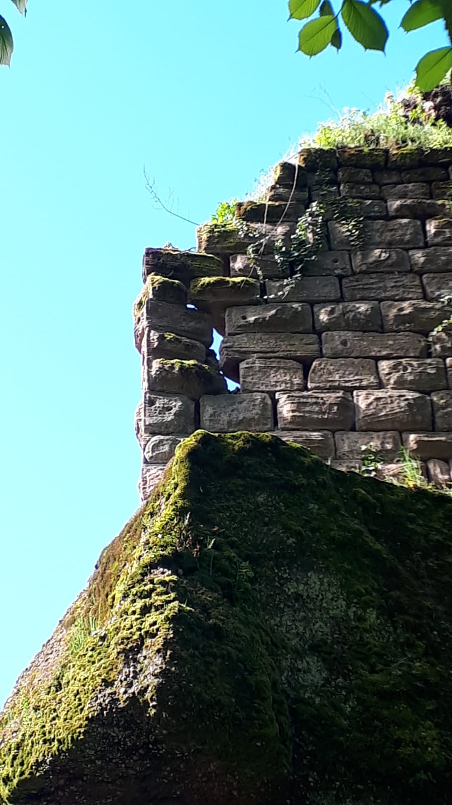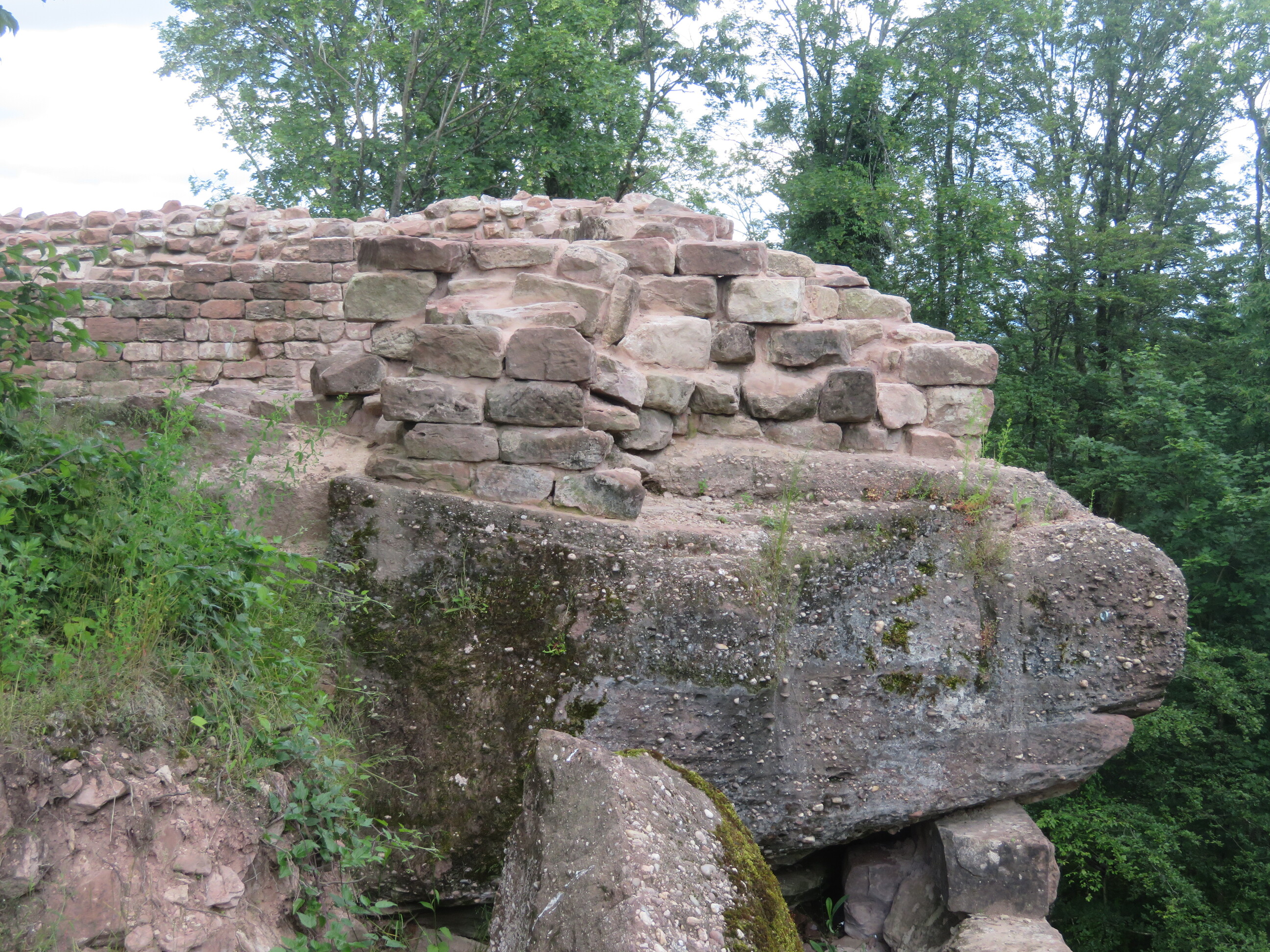 On peut supposer que le mur d’enceinte sous le rocher montait très haut et englobait initialement tout le rocher.