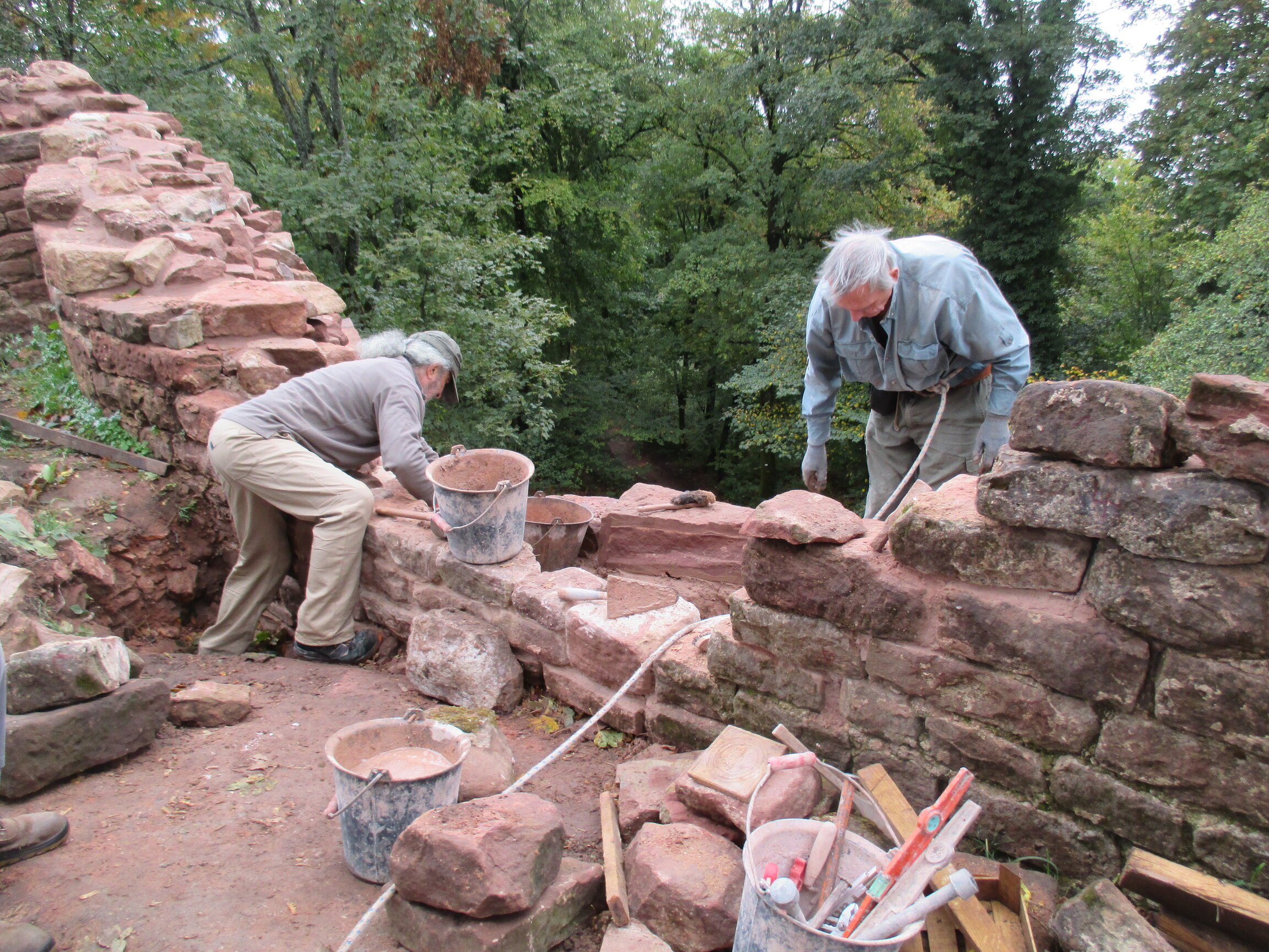 La réfection des parements intérieurs Nord et Est n’ayant pas été incluse dans les devis, nous avons nous même réalisé leur restauration en engageant une course contre la montre pour en faire le maximum avant que les ouvriers de la société Rauscher ne finissent la parement extérieur et le rocaillage.