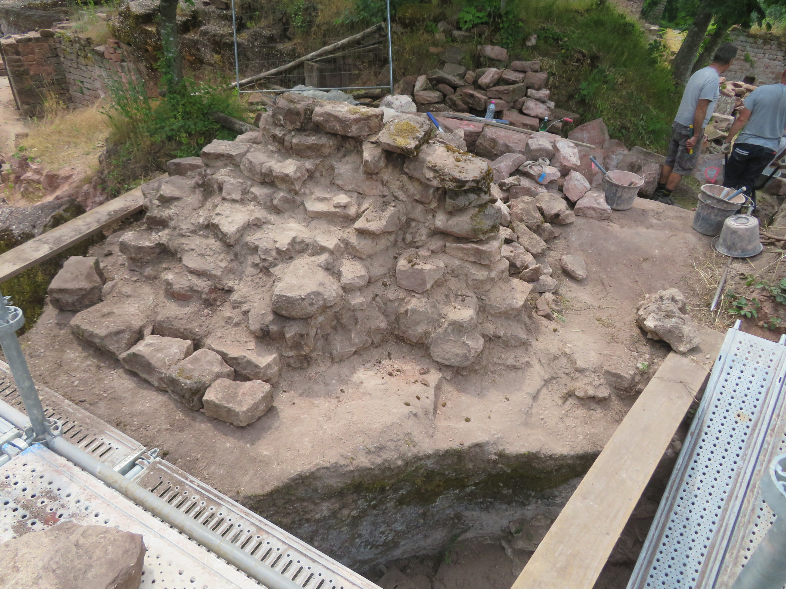 Suite au sondage réalisé par la DRAC et les MH en juillet 2021 constatant que le parement intérieur du mur d’enceinte était sain il a été convenu que nous pourrions décaisser tout le talus. Cela nous a permis de récupérer les blocs à bossage et surtout de mettre à jour le parement intérieur qui présentait bien une base saine mais dont les assises supérieures étaient très mal en point voire absentes.